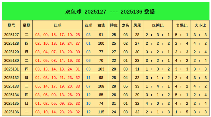 上期回顾:双色球第2025136期开出奖号:红球08、10、14、23、28、32;蓝球12,其中红球三区比为2:1:3,奇偶比1:5,大小比为3:3,蓝球开出0路号码12。