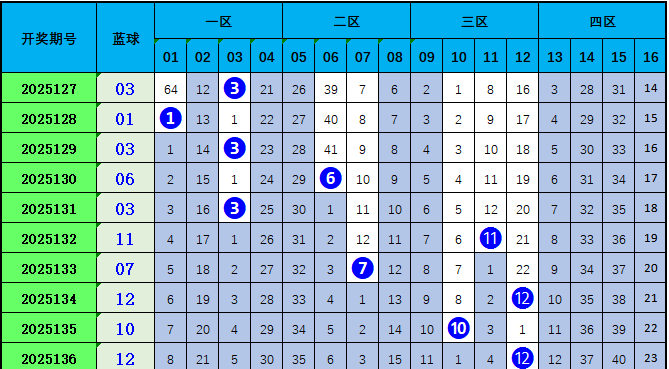 蓝球分析:蓝球上期开出0路号码12,最近10期蓝球号码012路比为6:3:1,0路号码活跃。本期预测开出0路号码,蓝球关注号码03。